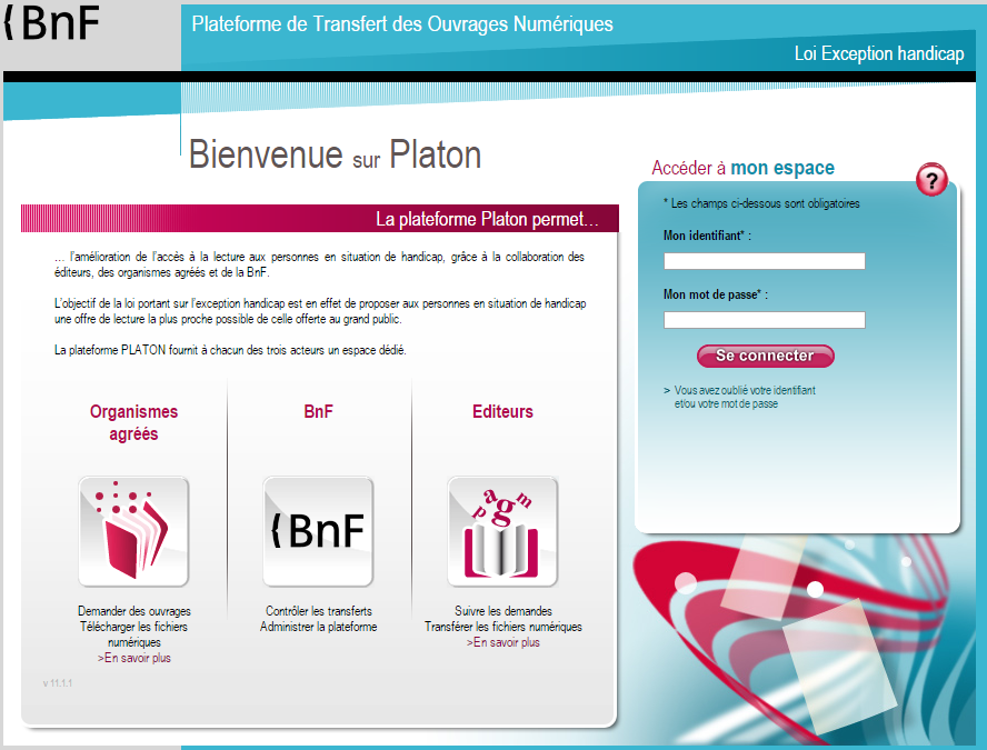 PLATON est la PLAteforme de Transfert d'Oeuvres Numériques de la BnF. Le principe est simple : les éditeurs déposent les fichiers des ouvrages demandés sur la plateforme que des structures agréées transcrivent en format adapté. On y trouve par exemple du pdf accessible, du format DAISY, du braille numérique. On y trouve de tout : des manuels scolaires et universitaires, des documentaires, de la fiction.